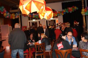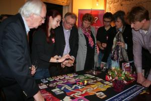 Na het officiële gedeelte was er veel belangstelling van de aanwezigen om het spel te bekijken. Mariska en Arnout waren als spelleiders actief om de informatie te geven over het doel en de werkwijze van Een Steekje Los?
