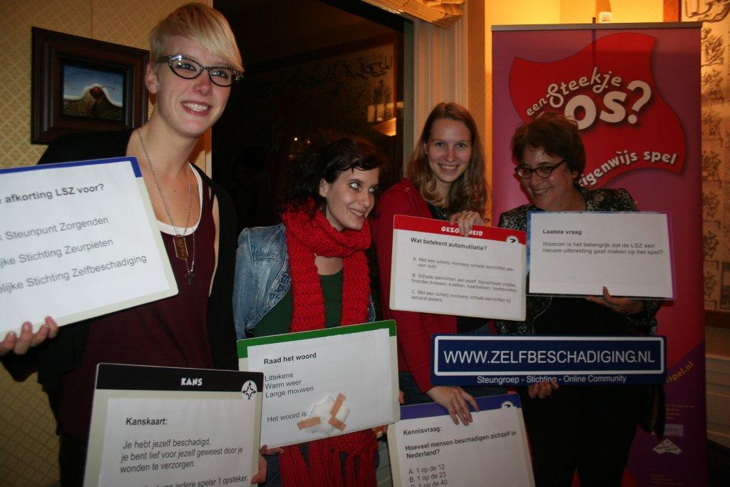 In 2012 waren er 2 genomineerde projecten voor de Stimuleringsprijs. Naast de LSZ was ook het UMC Wilhelmina Kinderziekenhuis genomineerd. Beide projecten moesten een pitch geven. Deze pitch heb ik samen met Sabine te Vaarwerk en Sonja Nijon gegeven, natuurlijk spelenderwijs. Aan de hand van de grote speelkaarten hebben we nieuwe vragen bedacht specifiek over Zelfbeschadiging. Ik was de spelleider en ik ging spelenderwijs in gesprek met Sabine te Vaarwerk en Sonja Nijon, als vertegenwoordigers van de LSZ.